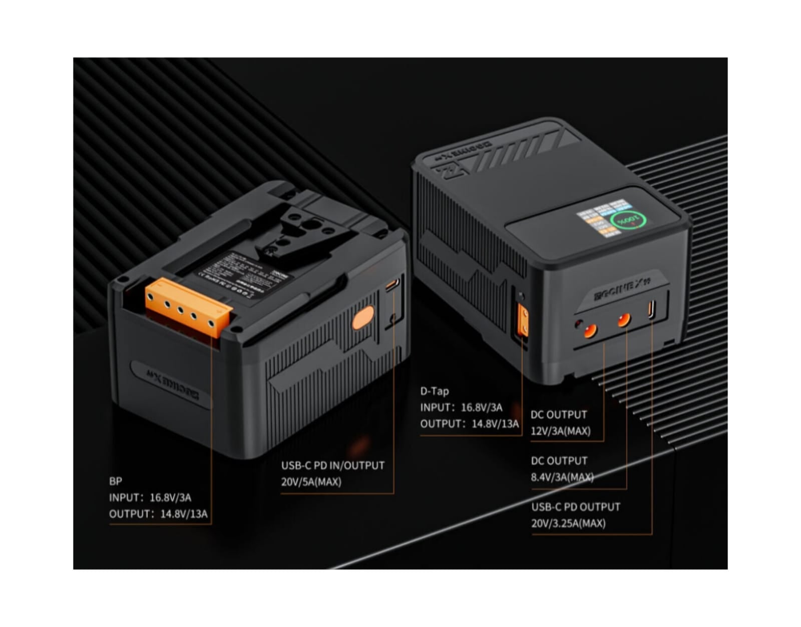 Cuenta con puertos de salida USB-C PD duales, puerto de salida USB-A, puertos de salida duales D-TAP de 14.8 V; puertos de salida duales de 12 V CC, que son compatibles con cámaras, videocámaras, monitores, teléfonos inteligentes, etc.