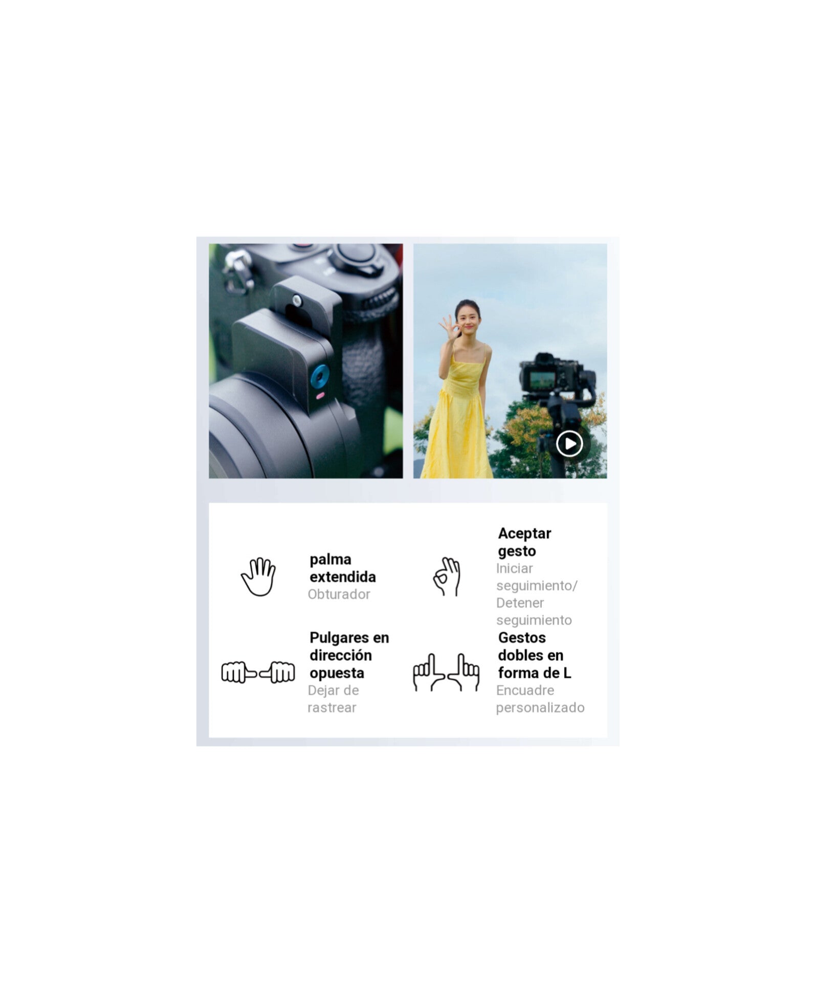 Sensor Al integrado para seguimiento inteligente: la unidad cuenta con un módulo de seguimiento de IA integrado, que permite disparos inteligentes sin la necesidad de instalar accesorios adicionales y aplicaciones. Hacer un gesto de "OK" permite el seguimiento de sujetos, mientras que otros gestos proporcionan control sobre la fotografía, el video y más, asegurando que captures cada momento dinámico.