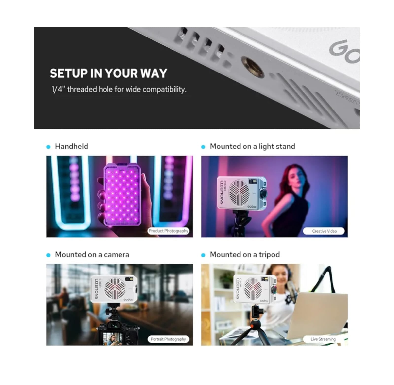 El Godox Litemons C30R es una luz LED portátil de 30W con modos RGB y CCT, que ofrece un rango de color de 1800K-10000K y hasta 39 efectos de iluminación.