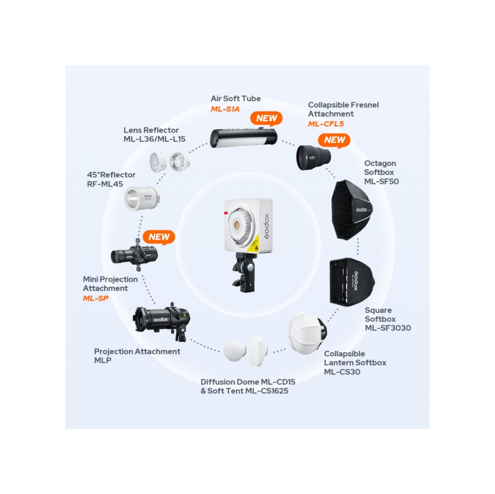 El ML100R es compatible con una amplia gama de modificadores compactos, desde reflectores de lentes hasta softboxes y accesorios de proyección. El ecosistema se enriquece aún más con nuevos accesorios versátiles, como el miniaccesorio de proyección, el accesorio Fresnel plegable y el tubo Air Soft. Juntos, conforman un ecosistema completo y en constante expansión de monturas Godox. (NO INCLUYE accesorios o modificadores)