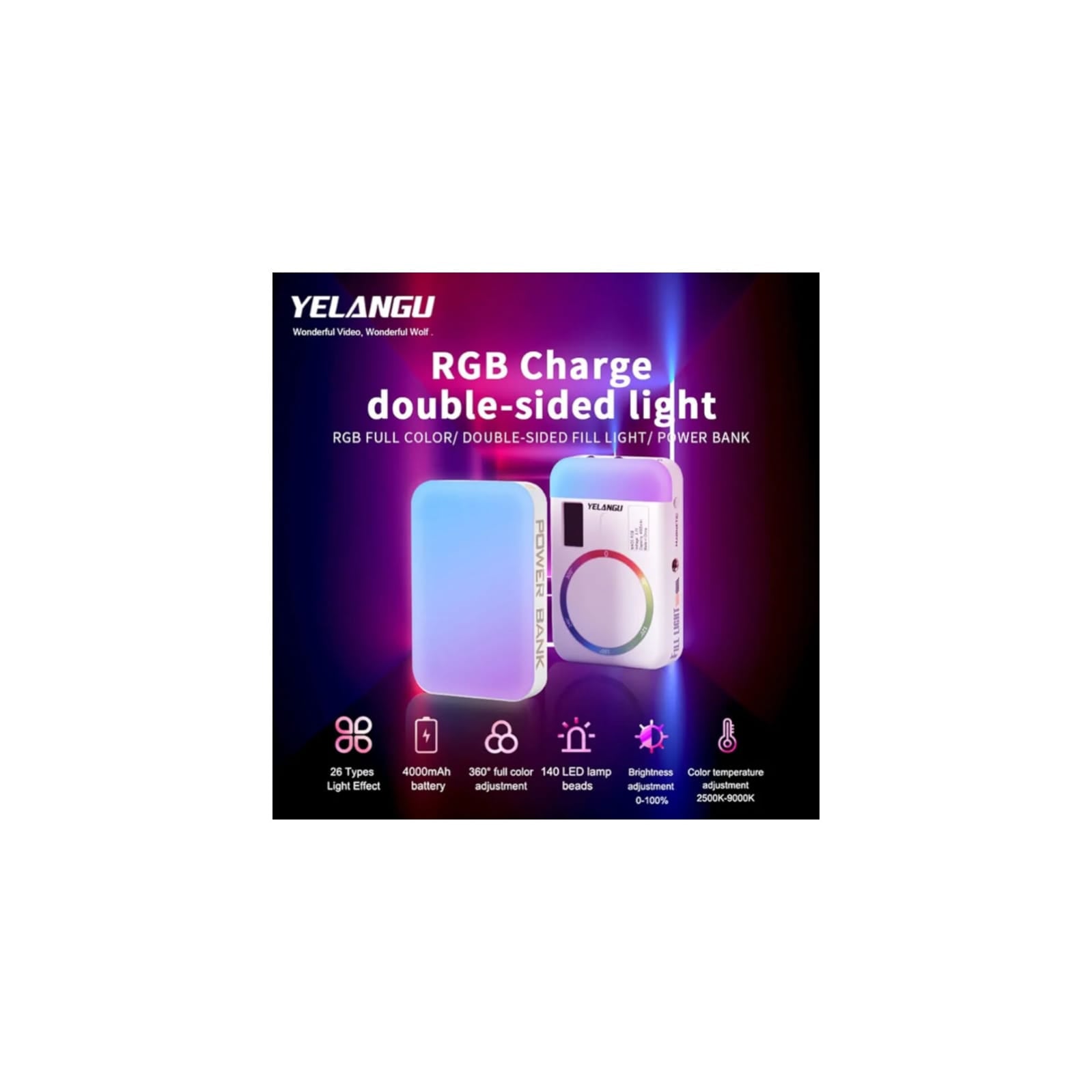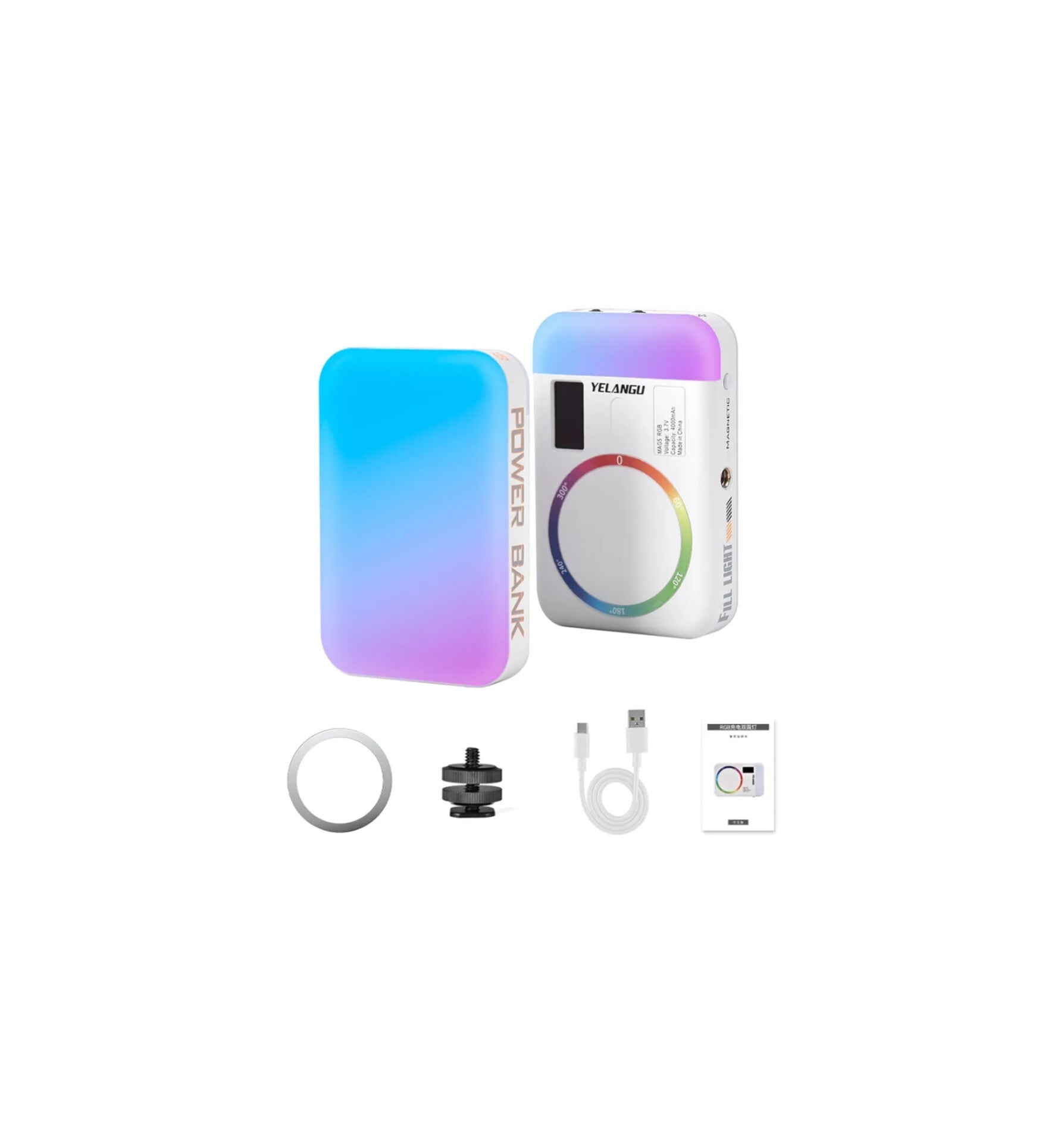 Mejora tus fotos y videos con el panel de luz LED de doble cara MAG5 RGB de YELANGU. Esta luz, compatible con MagSafe, ofrece un color variable para la luz de relleno, carga inalámbrica y fijación magnética. Su diseño de doble cara te permite usarla con las cámaras frontal y trasera de tu smartphone. Cuando la batería de 4000 mAh se agote, puedes recargarla con el cable USB-C incluido.