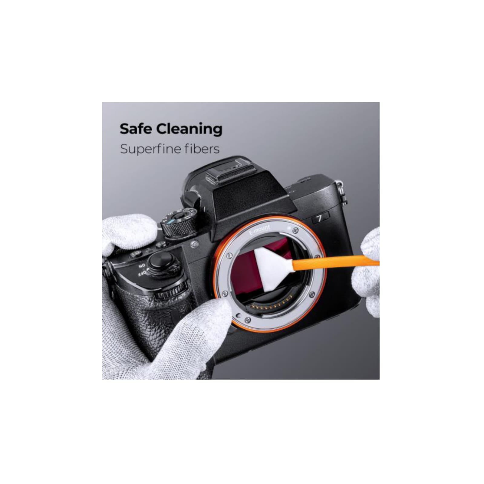 El diseño de dos extremos de los bastoncillos de limpieza se adapta al tamaño del sensor Full Frame, con un extremo frontal suave y resistente a los arañazos para cuidar el sensor.