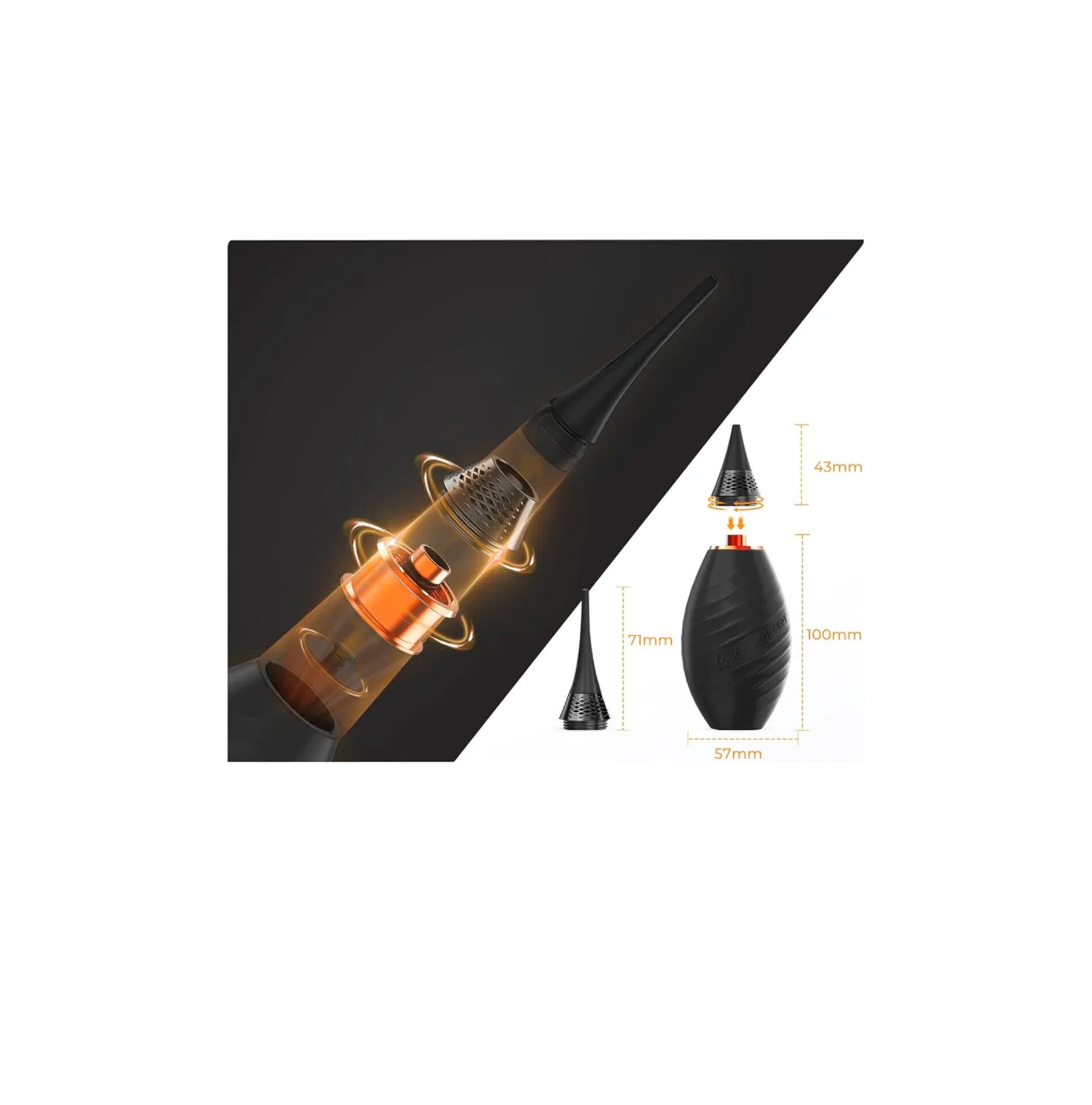 El soplador de polvo de cámara de boquilla larga es más adecuado para limpiar áreas más profundas como sensores DSLR y compartimentos de baterías de cámara. La boquilla corta es más adecuada para limpiar lentes, filtros, sensores sin espejo, superficies corporales y lentes.