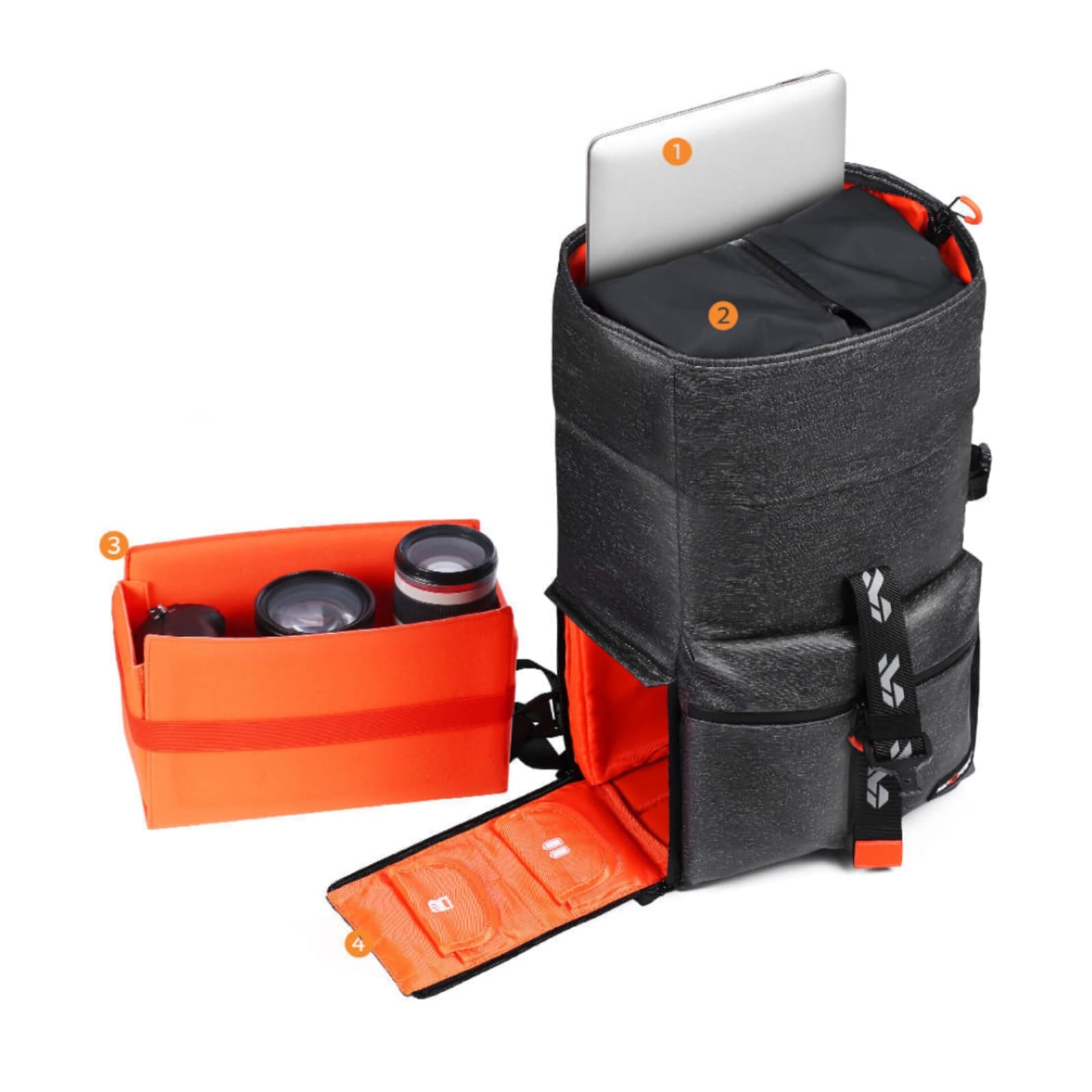 La todo en uno, para equipo fotográfico básico e ítems personales en el día a día. El compartimiento para la cámara es lateral, y en su parte superior esta la zona extensible para artículos personales.